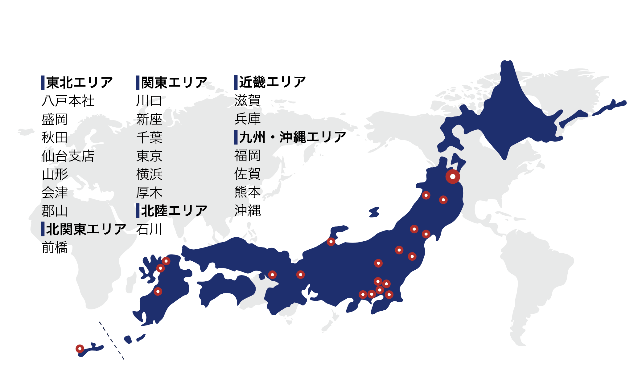 | サービス拠点 | 【東北エリア】 ・八戸本社 ・秋田サービスステーション ・盛岡サービスステーション ・仙台支店 ・山形サービスステーション ・会津サービスステーション ・郡山サービスステーション 【関東エリア】 ・前橋サービスステーション ・川口サービスステーション ・新座サービスステーション ・千葉サービスステーション ・横浜サービスステーション ・厚木サービスステーション 【北陸エリア】 ・石川サービスステーション 【近畿エリア】 ・滋賀サービスステーション ・兵庫サービスステーション 【九州・沖縄エリア】 ・福岡サービスステーション ・熊本サービスステーション ・沖縄サービスステーション |